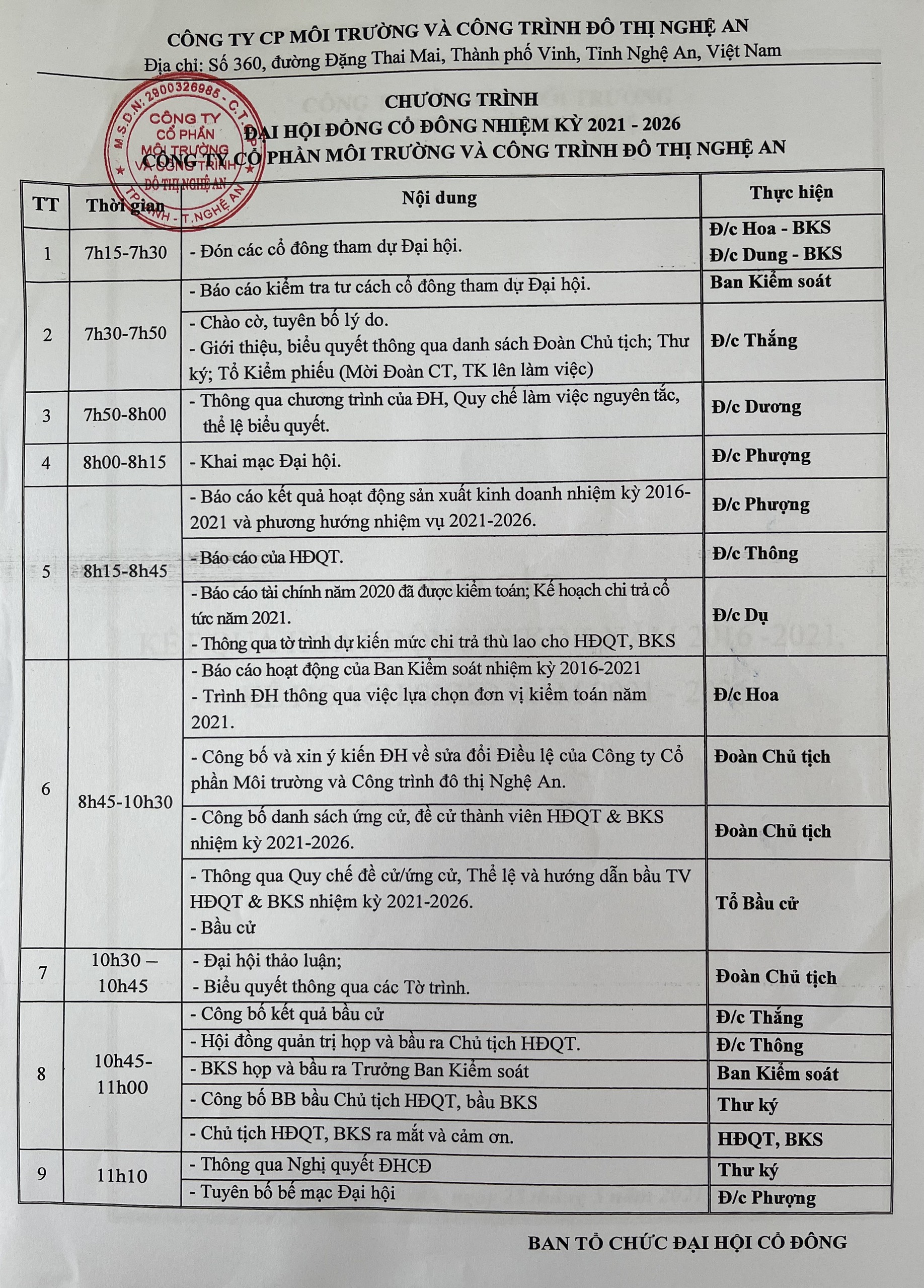 Công ty CP Môi trường và Công trình Đô thị Nghệ an Tổ chức thành công Đại hội đồng cổ đông thường niên năm 2019