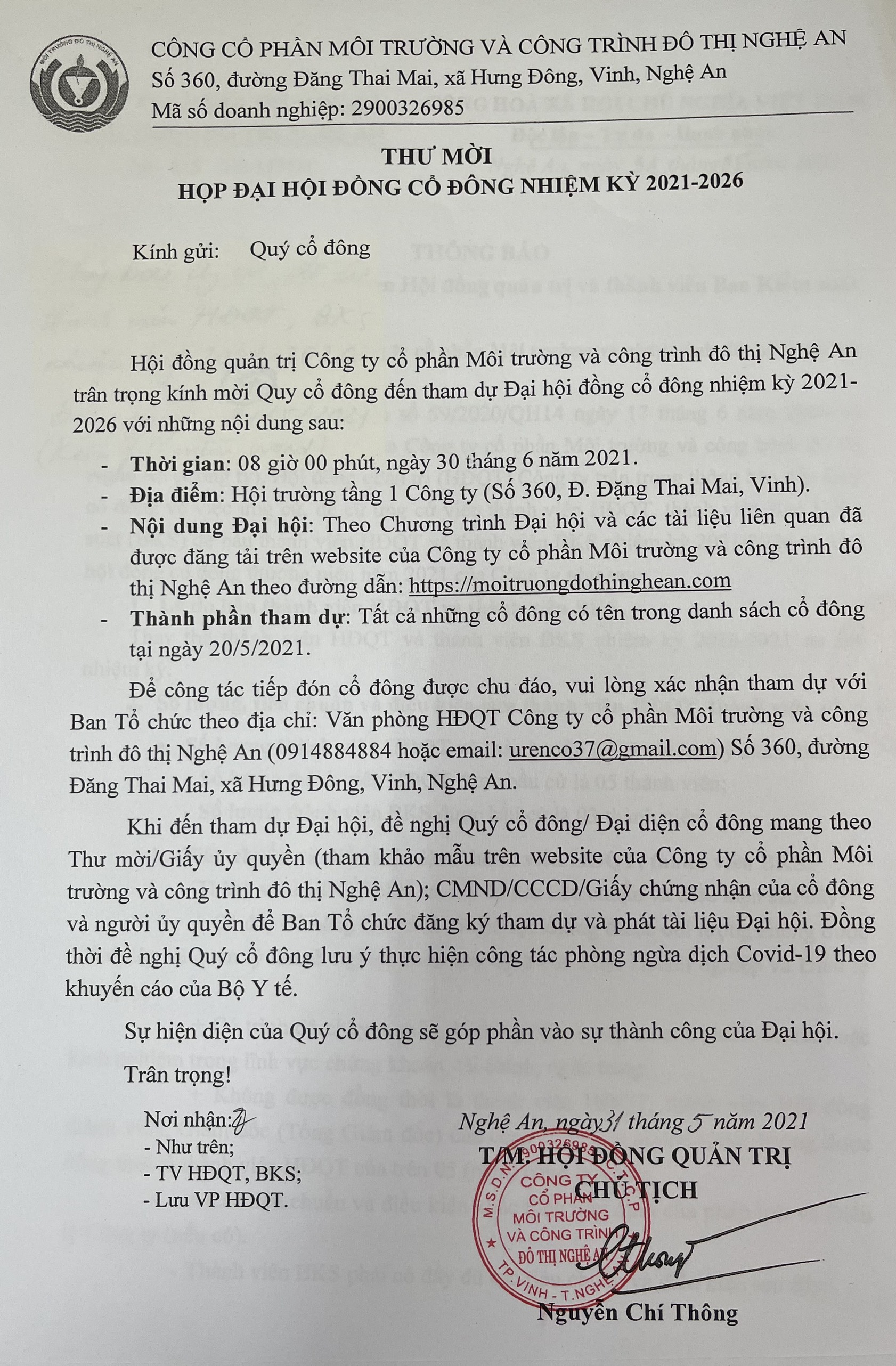 THƯ MỜI DỰ ĐẠI HỘI ĐỒNG CỔ ĐÔNG THƯỜNG NIÊN NĂM 2021