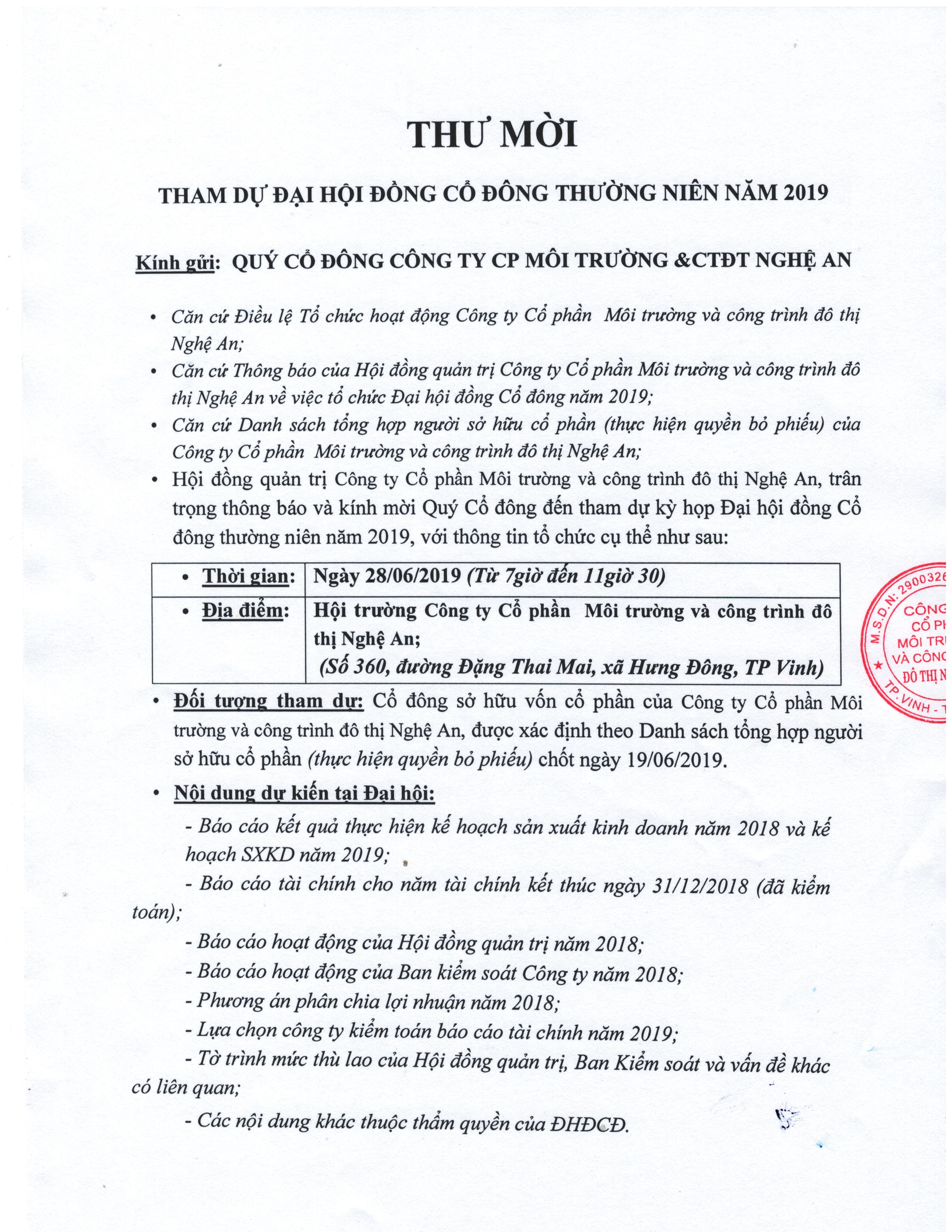 THƯ MỜI THAM DỰ ĐẠI HỘI ĐỒNG CỔ ĐÔNG THƯỜNG NIÊN NĂM 2019