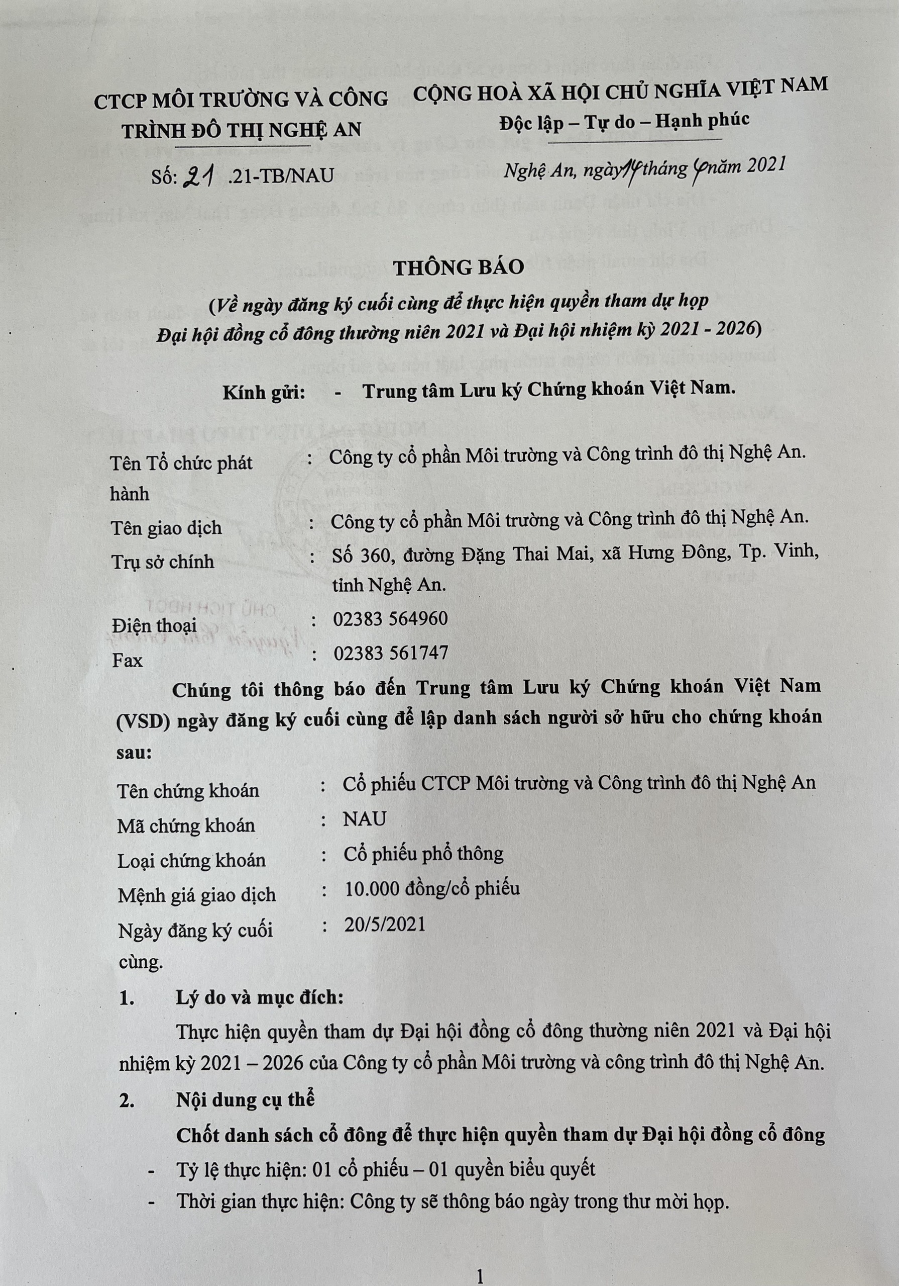 TB VỀ NGÀY ĐĂNG KÝ CUỐI CÙNG ĐỂ THỰC HIỆN QUYỀN THAM DỰ HỌP ĐHCĐ THƯỜNG NIÊN 2021 VÀ ĐH NHIỆM KỲ 2021-2026