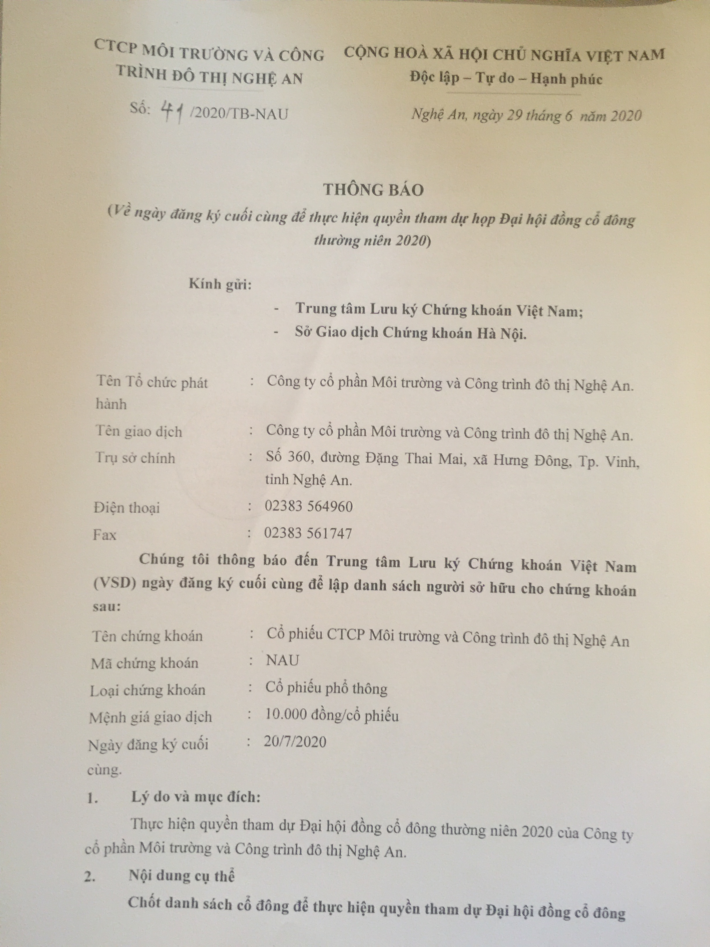 THÔNG BÁO VỀ NGÀY ĐĂNG KÝ CUỐI CÙNG ĐỂ THỰC HIỆN QUYỀN THAM DỰ HỌP ĐẠI HỘI ĐỒNG CỔ ĐÔNG THƯỜNG NIÊN NĂM 2020