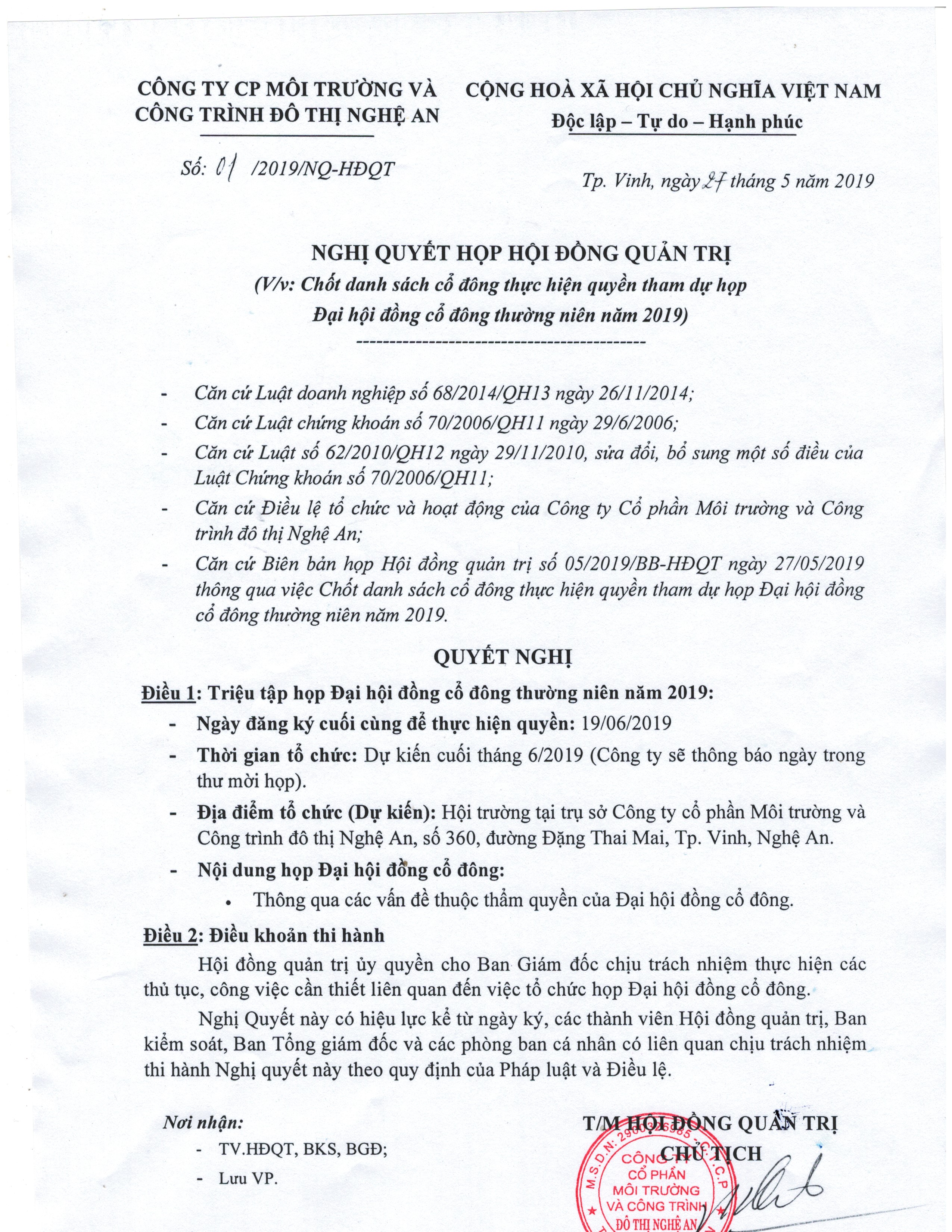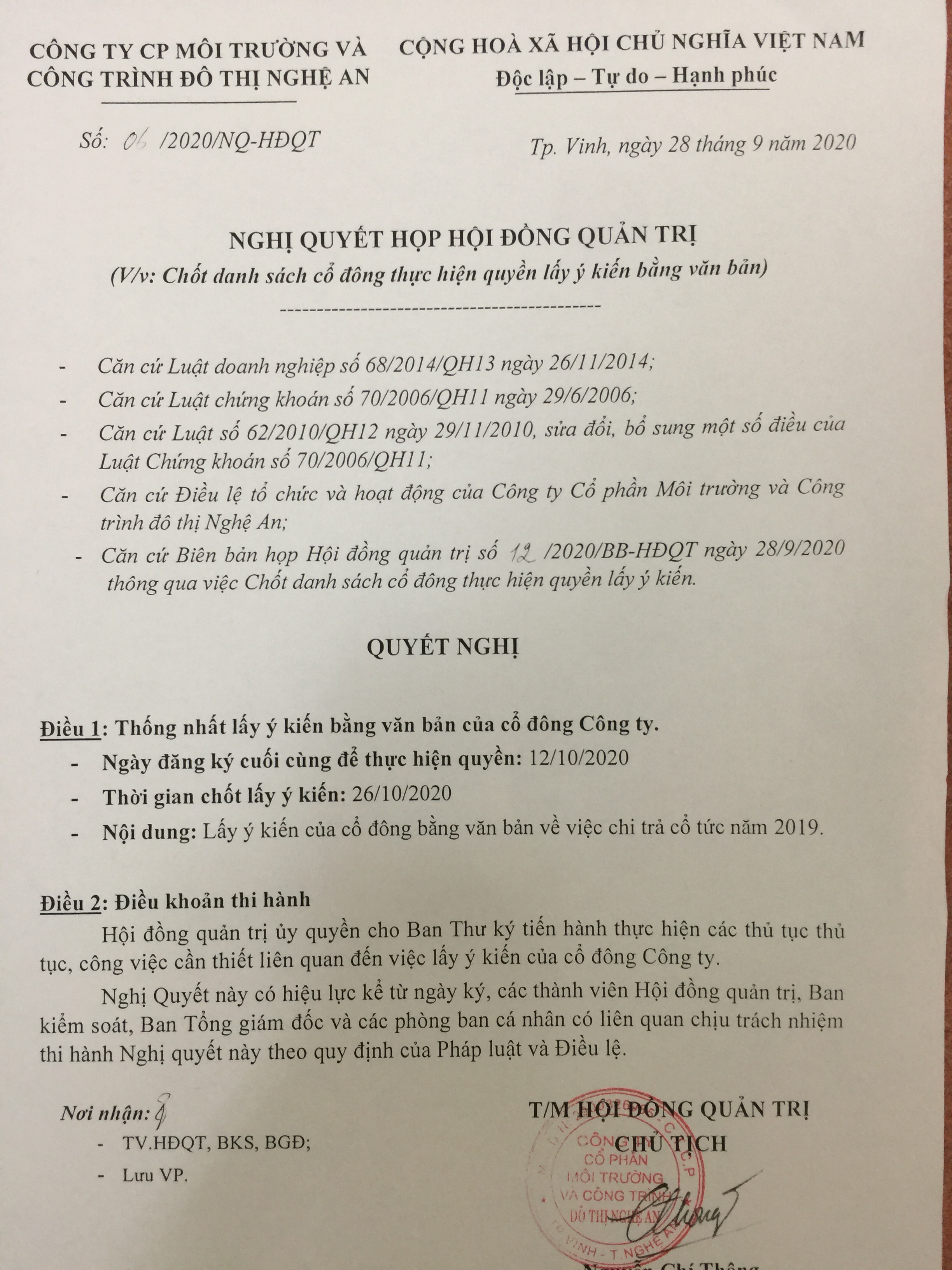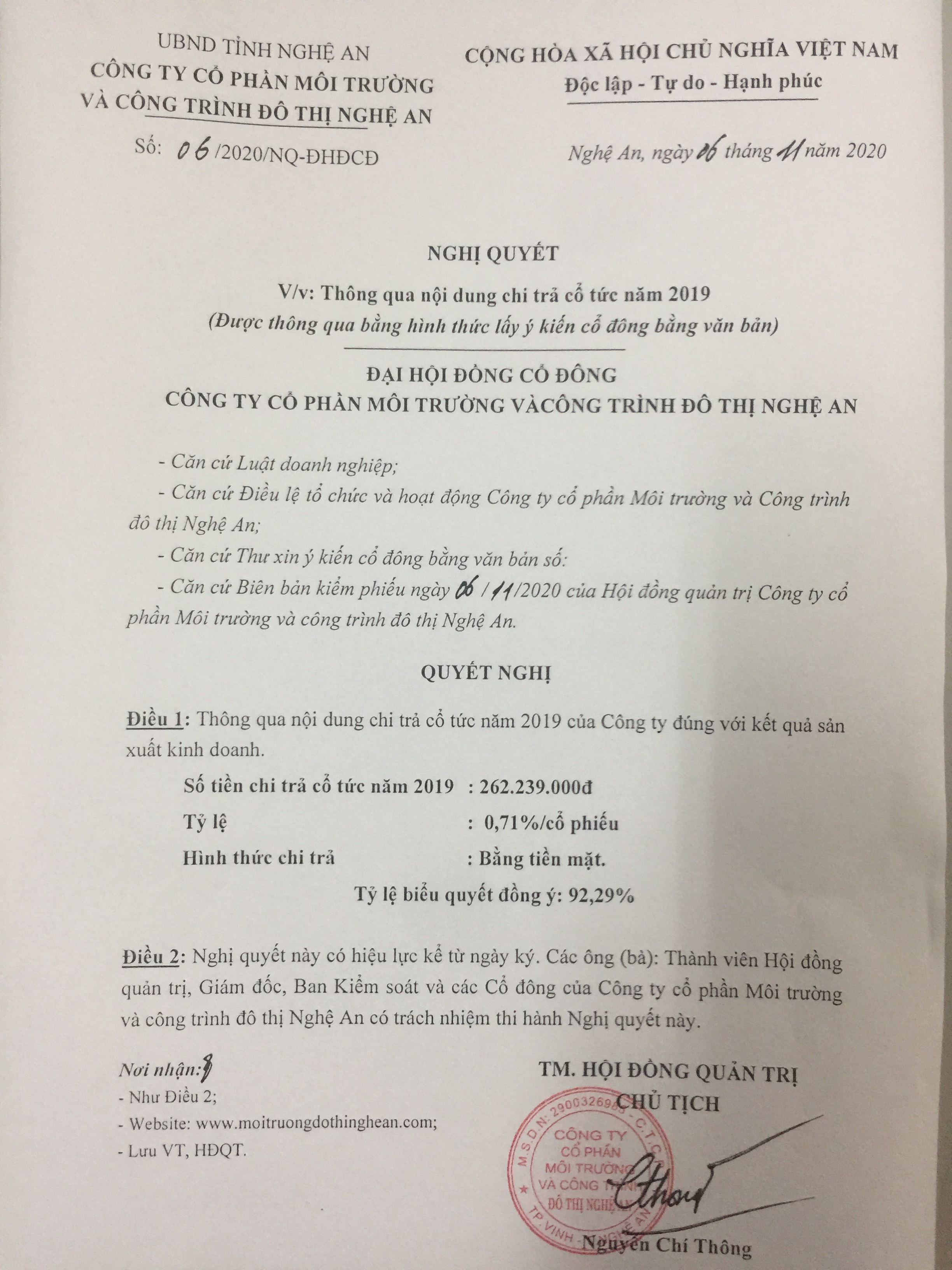 Nghị quyết về việc thông qua nội dung chi trả cổ tức năm 2019 (Được thông qua bằng hình thức lấy ý kiến cổ đông bằng văn bản);